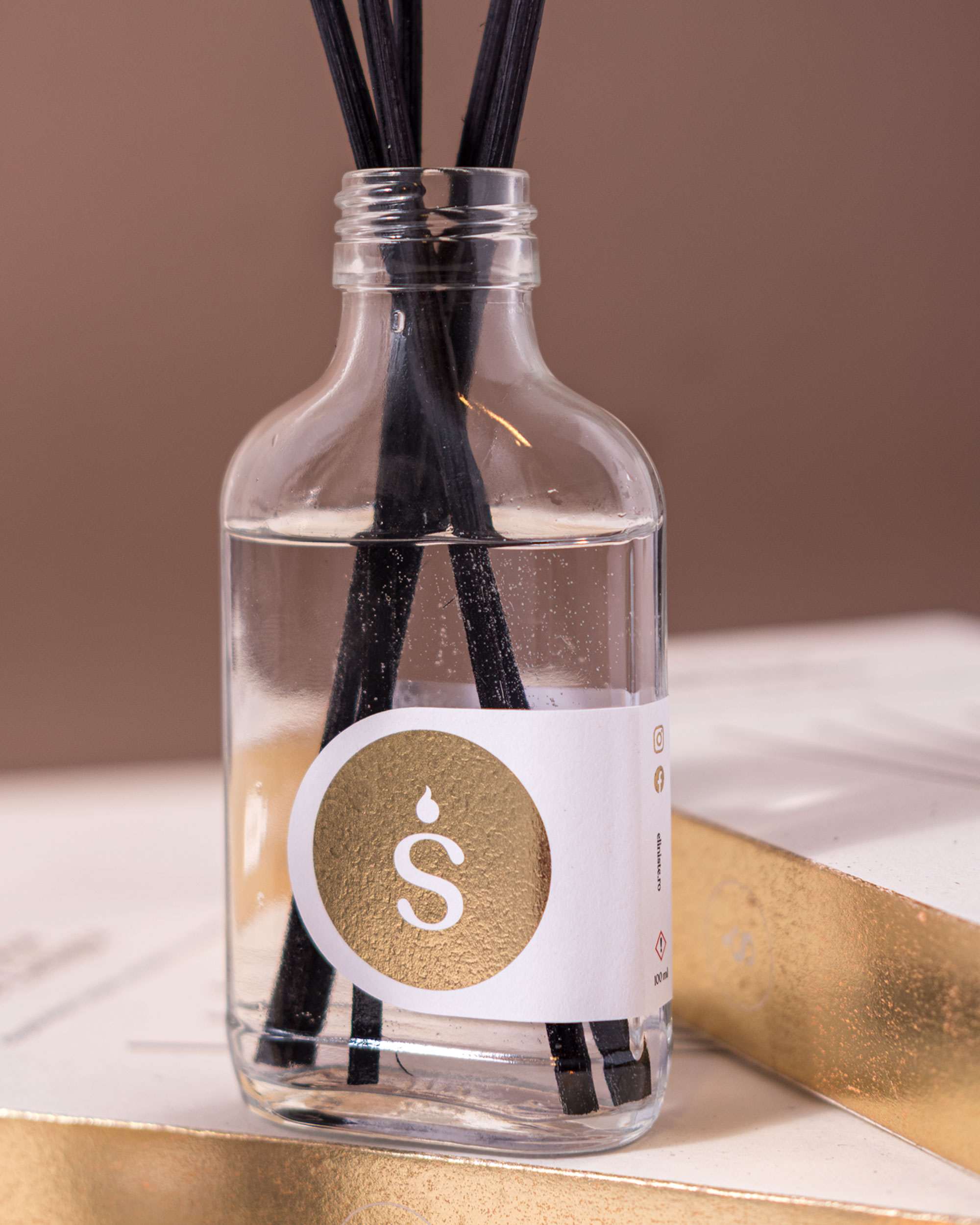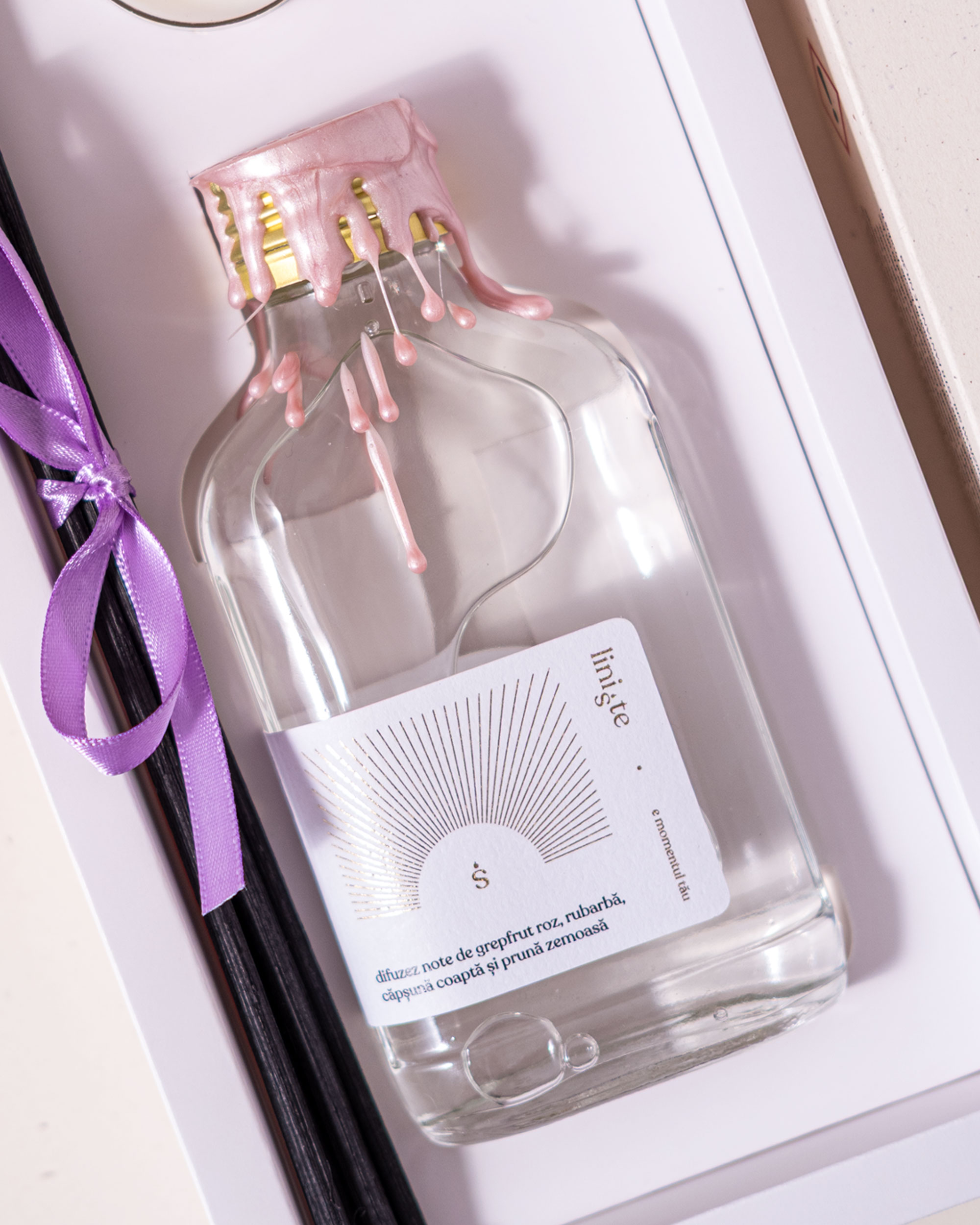 În cutia personalizată primești un difuzor cu ulei infuzat 100 ml, 5 bețe din ratan natural și o lumânare de 15g cu fitil de bumbac din același miros.
