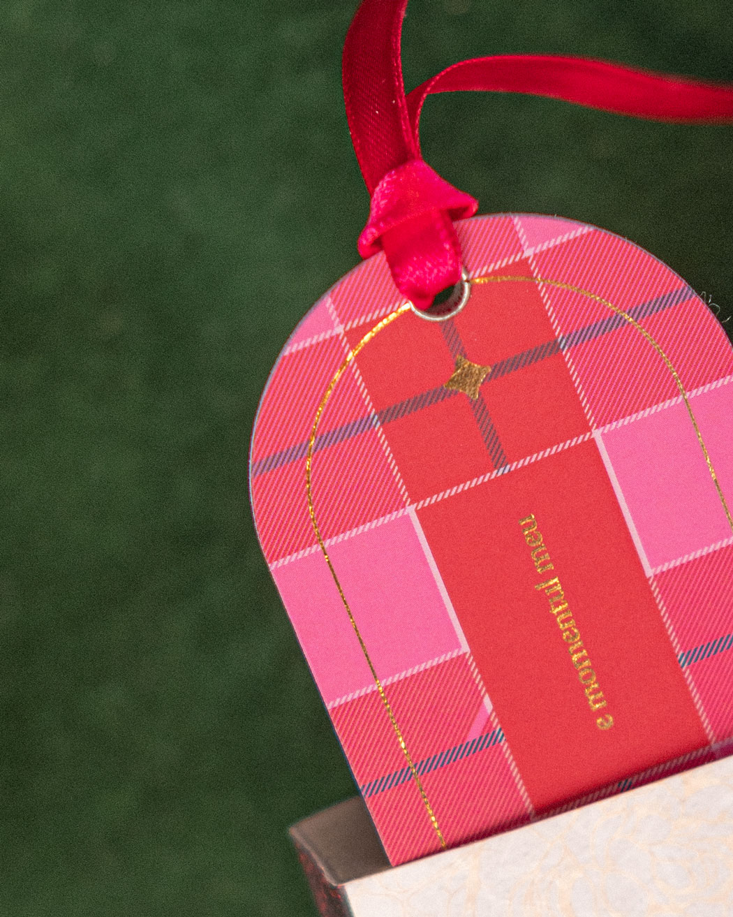 Finisat cu capsa aurie, șnur din panglică si o grafică festivă.